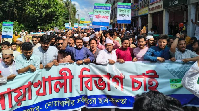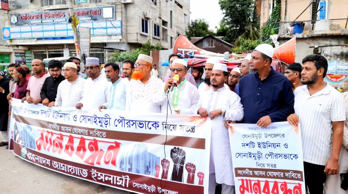 স্টাফ রিপোর্টার, নোয়াখালী: নোয়াখালীর সোনাইমুড়ীকে সংসদীয় আসন ঘোষণার দাবিতে জামায়াতের মানববন্ধন অনুষ্ঠিত হয়েছে। শুক্রবার বিকালে সোনাইমুড়ী উপজেলার ১০টি ইউনিয়ন ও ১টি পৌরসভা নিয়ে স্বতন্ত্র সংসদীয় আসন ঘোষণার দাবিতে বাইপাস চত্বরের